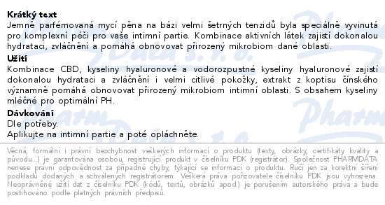 Jemně parfémovaná mycí pěna na bázi velmi šetrných tenzidů byla speciálně vyvinutá pro komplexní péči pro vaše intimní partie. Kombinace aktivních látek zajistí dokonalou hydrataci, zvláčnění a pomáhá obnovovat přirozený mikrobiom dané oblasti.
