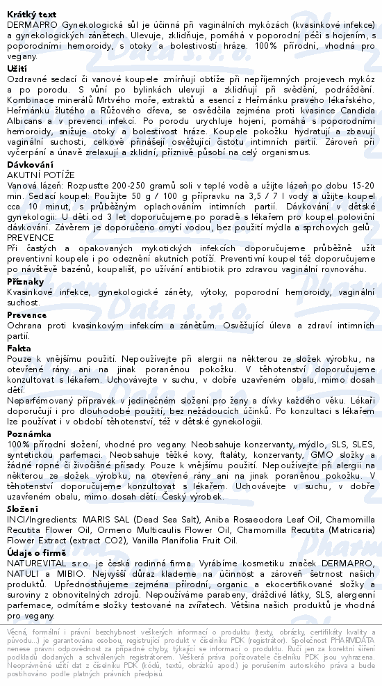 DERMAPRO Gynekologická sůl je účinná při vaginálních mykózách (kvasinkové infekce) a gynekologických zánětech. Ulevuje, zklidňuje, pomáhá v poporodní péči s hojením, s poporodními hemoroidy, s otoky a bolestivostí hráze. 100% přírodní, vhodná pro vegany.