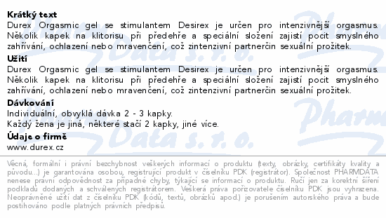 Durex Orgasmic gel se stimulantem Desirex je určen pro intenzivnější orgasmus. Několik kapek na klitorisu při předehře a speciální složení zajistí pocit smyslného zahřívání, ochlazení nebo mravenčení, což zintenzivní partnerčin sexuální prožitek.