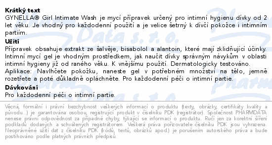 GYNELLA® Girl Intimate Wash je mycí přípravek určený pro intimní hygienu dívky od 2 let věku. Je vhodný pro každodenní použití a je velice šetrný k dívčí pokožce i intimním partiím.