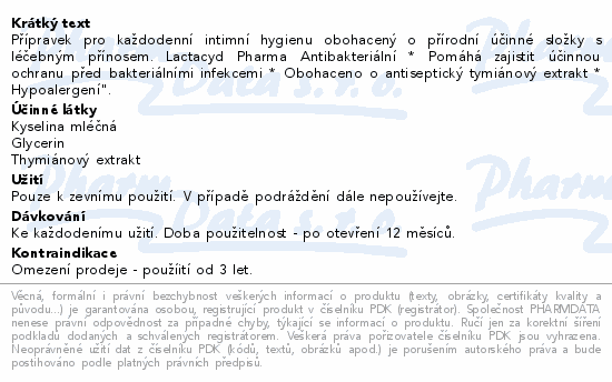 Přípravek pro každodenní intimní hygienu obohacený o přírodní účinné složky s léčebným přínosem. Lactacyd Pharma Antibakteriální * Pomáhá zajistit účinnou ochranu před bakteriálními infekcemi * Obohaceno o antiseptický tymiánový extrakt * Hypoalergení".