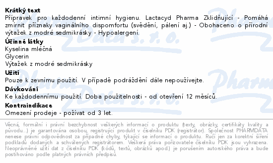 Přípravek pro každodenní intimní hygienu. Lactacyd Pharma Zklidňující - Pomáhá zmírnit příznaky vaginálního dispomfortu (svědění, pálení aj.) - Obohaceno o přírodní výtažek z modré sedmikrásky - Hypoalergení.