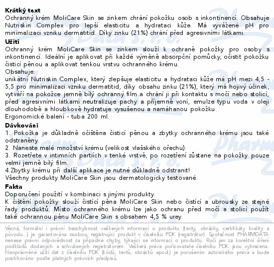 Ochranný krém MoliCare Skin chrání pokožku před škodlivými látkami obsaženými v moči a stolici. Obsahuje unikátní Nutriskin Complex, který zlepšuje elasticitu a hydrataci kůže. Pohlcuje pachy a má pH mezi 4,5-5,5 pro minimalizaci vzniku dermatitid.