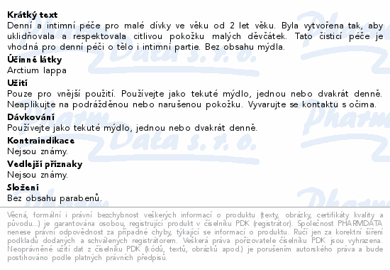 Denní a intimní péče pro malé dívky ve věku od 2 let věku. Byla vytvořena tak, aby uklidňovala a respektovala citlivou pokožku malých děvčátek. Tato čisticí péče je vhodná pro denní péči o tělo i intimní partie. Bez obsahu mýdla.
