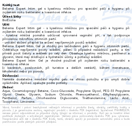 Beliema Expert Intim gel s kyselinou mléčnou pro speciální péči a hygienu při zvýšeném riziku bakteriální a kvasinkové infekce.
