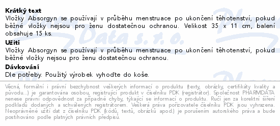 Vložky Absorgyn se používají v průběhu menstruace po ukončení těhotenství, pokud běžné vložky nejsou pro ženu dostatečnou ochranou. Velikost 35 x 11 cm, balení obsahuje 15 ks.