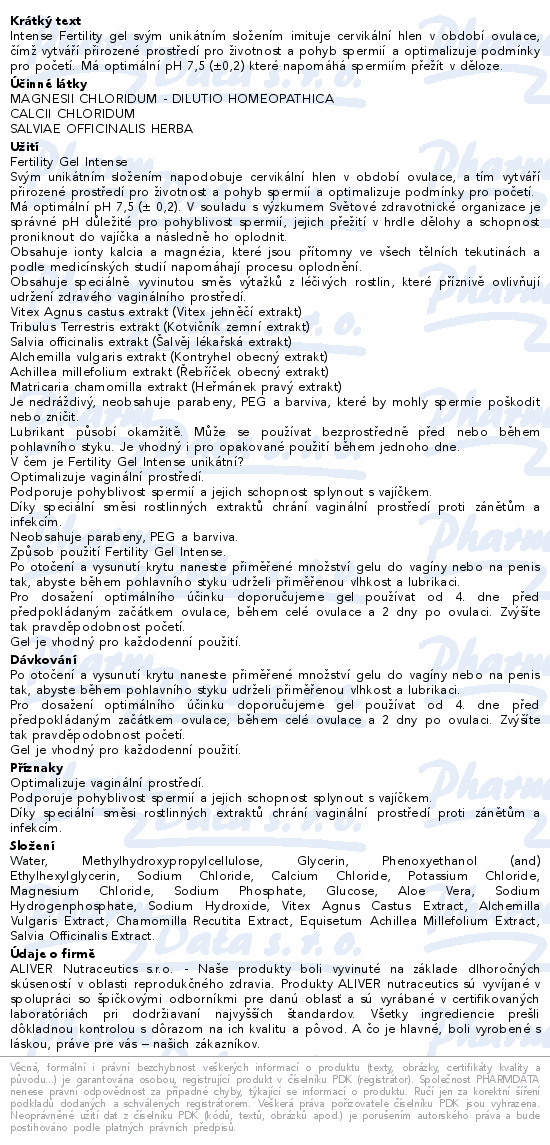 Intense Fertility gel svým unikátním složením imituje cervikální hlen v období ovulace, čímž vytváří přirozené prostředí pro životnost a pohyb spermií a optimalizuje podmínky pro početí. Má optimální pH 7,5 (±0,2) které napomáhá spermiím přežít v děloze.
