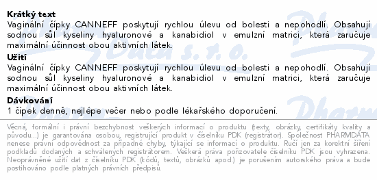 Vaginální čípky CANNEFF poskytují rychlou úlevu od bolesti a nepohodlí. Obsahují sodnou sůl kyseliny hyaluronové a kanabidiol v emulzní matrici, která zaručuje maximální účinnost obou aktivních látek.