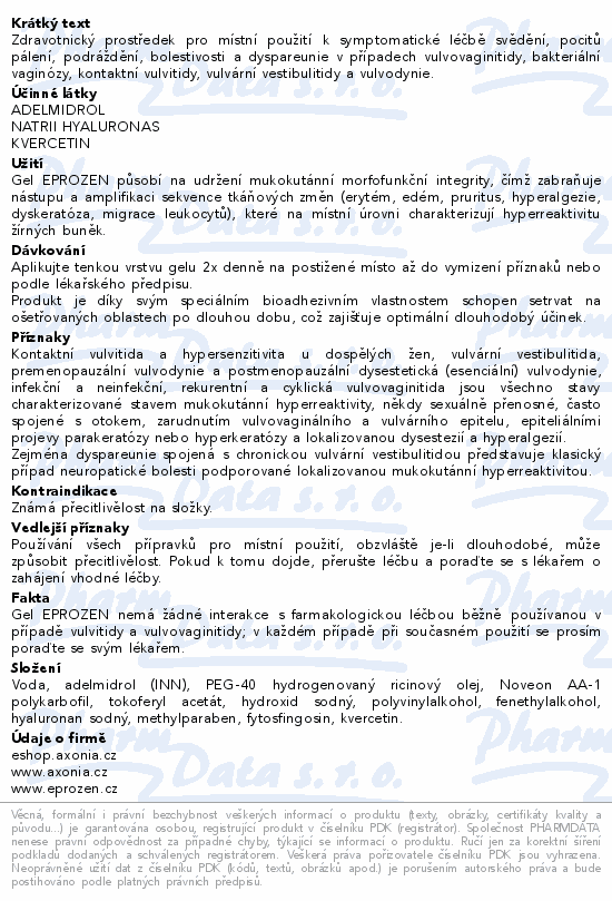 Zdravotnický prostředek pro místní použití k symptomatické léčbě svědění, pocitů pálení, podráždění, bolestivosti a dyspareunie v případech vulvovaginitidy, bakteriální vaginózy, kontaktní vulvitidy, vulvární vestibulitidy a vulvodynie.