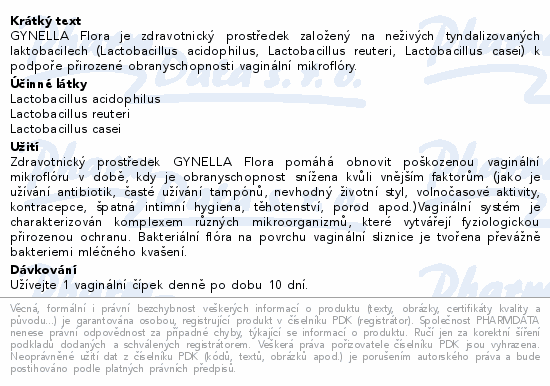 GYNELLA Flora je zdravotnický prostředek založený na neživých tyndalizovaných laktobacilech (Lactobacillus acidophilus, Lactobacillus reuteri, Lactobacillus casei) k podpoře přirozené obranyschopnosti vaginální mikroflóry.