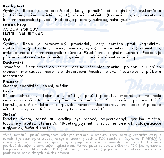 Gynimun Rapid je zdr.prostředek, který pomáhá při vaginálním dyskomfortu (podráždění, pálení, svědění, výtok), včetně infekčního (bakteriálního, mykotického a trichomonádového) původu. Podporuje přirozený vulvovaginální systém.