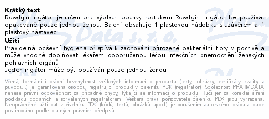 Rosalgin Irigátor je určen pro výplach pochvy roztokem Rosalgin. Irigátor lze používat opakovaně pouze jednou ženou. Balení obsahuje 1 plastovou nádobku s uzávěrem a 1 plastový nástavec.