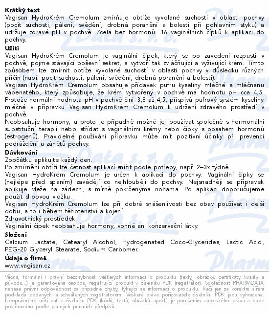 Doporučené použití: 1x denně nebo méně často (např. 2-3krát týdně). Četnost užívání závisí na individuálním diskomfortu. Vaginální čípky se zavádějí co nejhlouběji do pochvy, nejlépe před spaním. Vagisan HydroKrém Cremolum lze používat i během těhotenství a při kojení.