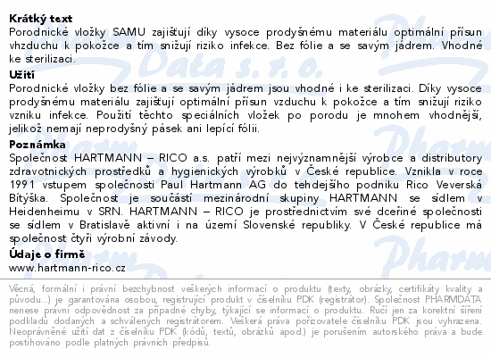 Porodnické vložky SAMU zajišťují díky vysoce prodyšnému materiálu optimální přísun vhzduchu k pokožce a tím snižují riziko infekce. Bez fólie a se savým jádrem. Vhodné ke sterilizaci.