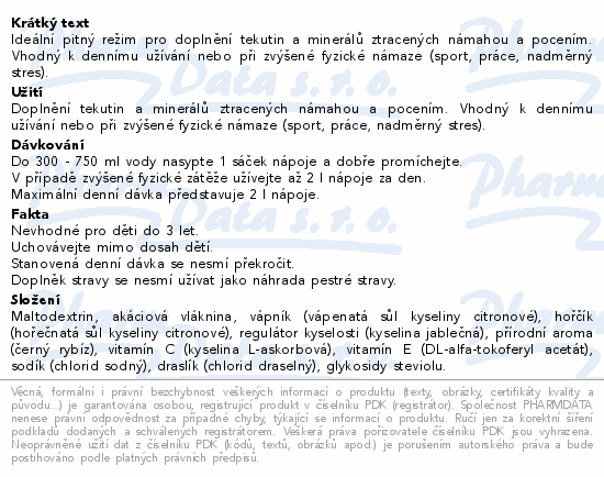 Ideální pitný režim pro doplnění tekutin a minerálů ztracených námahou a pocením. Vhodný k dennímu užívání nebo při zvýšené fyzické námaze (sport, práce, nadměrný stres).