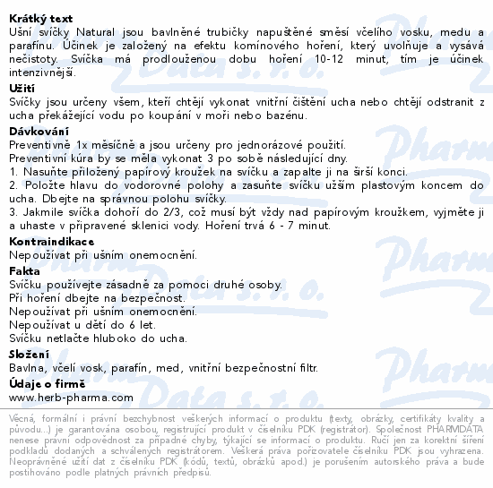 Ušní svíčky Natural jsou bavlněné trubičky napuštěné směsí včelího vosku, medu a parafínu. Účinek je založený na efektu komínového hoření, který uvolňuje a vysává nečistoty. Svíčka má prodlouženou dobu hoření 10-12 minut, tím je účinek intenzivnější.