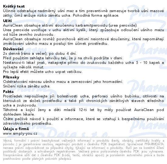 Účinně odstraňuje nadměrný ušní maz a tím preventivně zamezuje tvorbě ušní mazové zátky, čímž snižuje riziko zánětu ucha. Pohodlná forma aplikace.