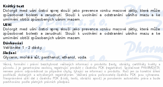 Dolorgit med ušní čisticí sprej slouží jako prevence vzniku mazové zátky, která může způsobovat bolesti a zarudnutí. Slouží k uvolnění a odstranění ušního mazu a ke umírnění obtíží způsobených ušním mazem.