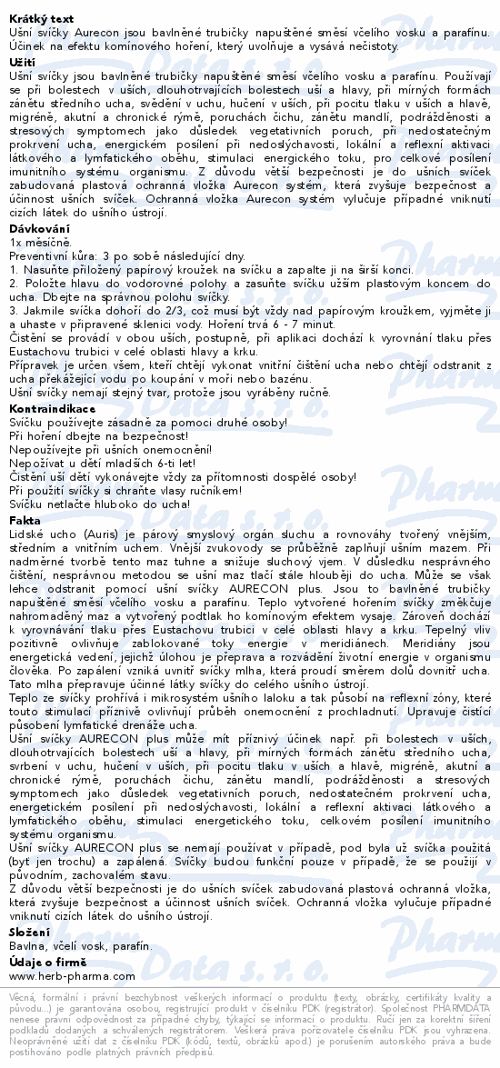 Ušní svíčky Aurecon jsou bavlněné trubičky napuštěné směsí včelího vosku a parafínu. Účinek na efektu komínového hoření, který uvolňuje a vysává nečistoty.