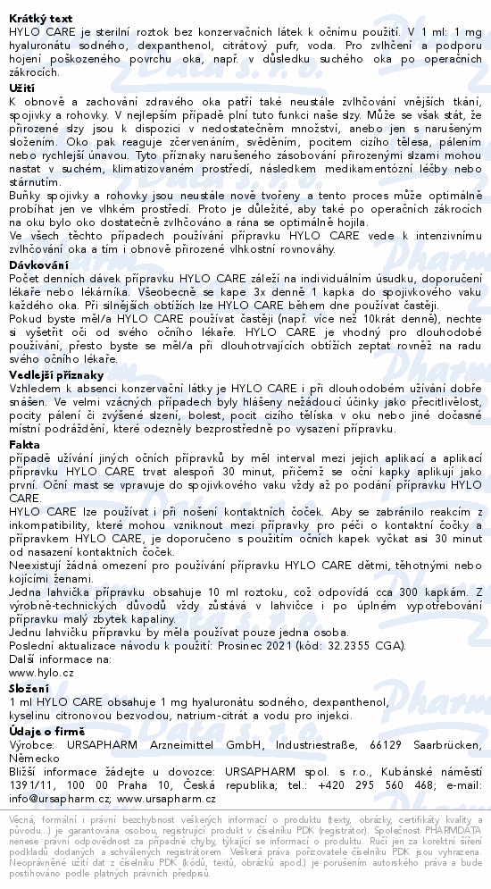 HYLO CARE® je sterilní roztok bez konzervačních látek k očnímu použití. V 1 ml: 1 mg hyaluronátu sodného, dexpanthenol, citrátový pufr, voda. Pro zvlhčení a podporu hojení poškozeného povrchu oka, např. v důsledku suchého oka po operačních zákrocích.
