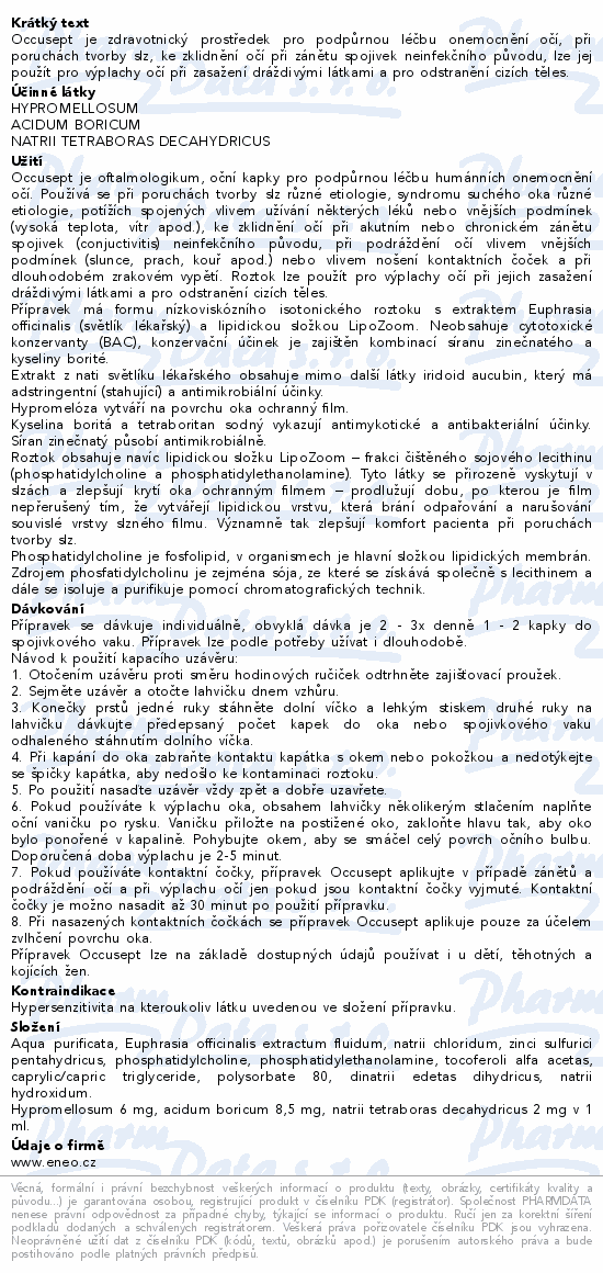Occusept oční kapky jsou zdravotnický prostředek určené ke zvlhčení, proplachování a čištění očí a očního okolí. Obsahují kombinaci látek, které mají zklidňující, hydratační a antiseptické vlastnosti: