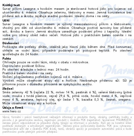 Sunar příkrm Lasagne s hovězím masem je sterilované hotové jídlo pro kojence od ukončeného 6. měsíce. Obsahuje zeleninu, těstoviny a maso. Jemná konzistence bez přidané soli a škrobu zajišťuje snadné podávání. Ideální doma i na cesty.