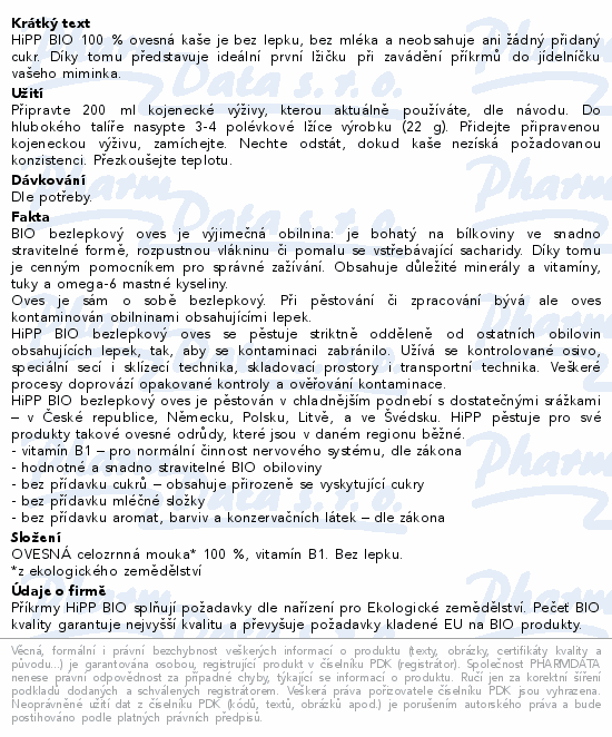 HiPP BIO 100 % ovesná kaše je bez lepku, bez mléka a neobsahuje ani žádný přidaný cukr. Díky tomu představuje ideální první lžičku při zavádění příkrmů do jídelníčku vašeho miminka.
