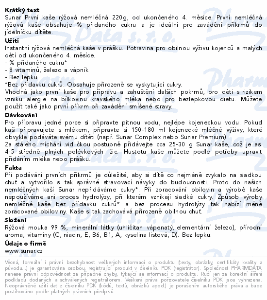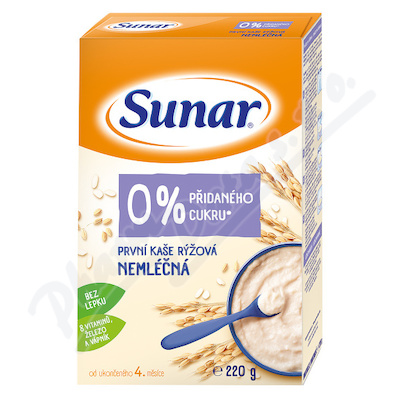 Sunar První kaše rýžová nemléčná 220g, od ukončeného 4. měsíce. První nemléčná rýžová kaše obsahuje 0 % přidaného cukru a je ideální pro zavádění příkrmů do jídelníčku dítěte.