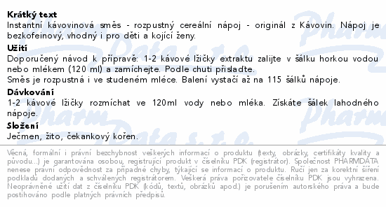 Instantní kávovinová směs - rozpustný cereální nápoj - originál z Kávovin. Nápoj je bezkofeinový, vhodný i pro děti a kojící ženy.