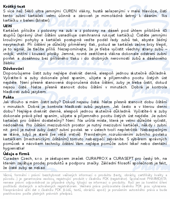 S více než 5460 ultra jemnými CUREN vlákny, hustě seřazenýmí v malé hlavičce, čistí tento zubní kartáček velmi účinně a zároveň je mimořádně šetrný k dásním. 1ks kartáčku v balení (blister).