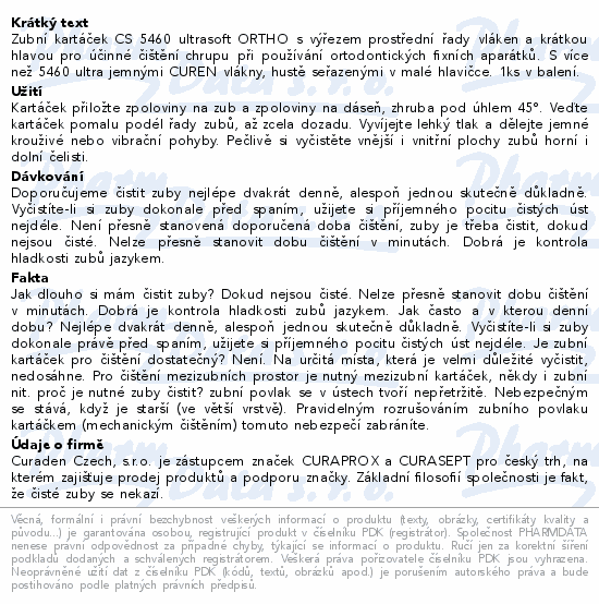 Zubní kartáček CS 5460 ultrasoft ORTHO s výřezem prostřední řady vláken a krátkou hlavou pro účinné čištění chrupu při používání ortodontických fixních aparátků. S více než 5460 ultra jemnými CUREN vlákny, hustě seřazenými v malé hlavičce. 1ks v balení.