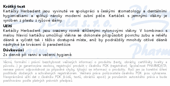 Kartáčky Herbadent jsou vyvinuté ve spolupráci s českými stomatology a dentálními hygienistkami a splňují nároky moderní zubní péče. Kartáček s jemnými vlákny je vyroben z plastu z rýžové slámy.