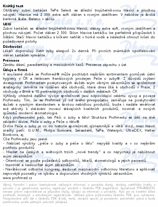 Oblíbený zubní kartáček TePe Select se střední trojúhelníkovou hlavicí a plochou rukojetí. Hlavice má 2 500 extra soft vláken s rovným zástřihem. V nabídce je široká barevná škála. Baleno v sáčku.