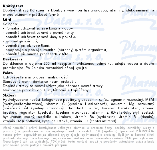 Doplněk stravy Kolagen na klouby s kyselinou hyaluronovou, vitamíny, glukosaminem a chondroitinem v práškové formě.