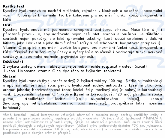 Kyselina hyaluronová se nachází v tkáních, zejména v kloubech a pokožce, liposomální vitamin C přispívá k normální tvorbě kolagenu pro normální funkci kostí, chrupavek a kůže.