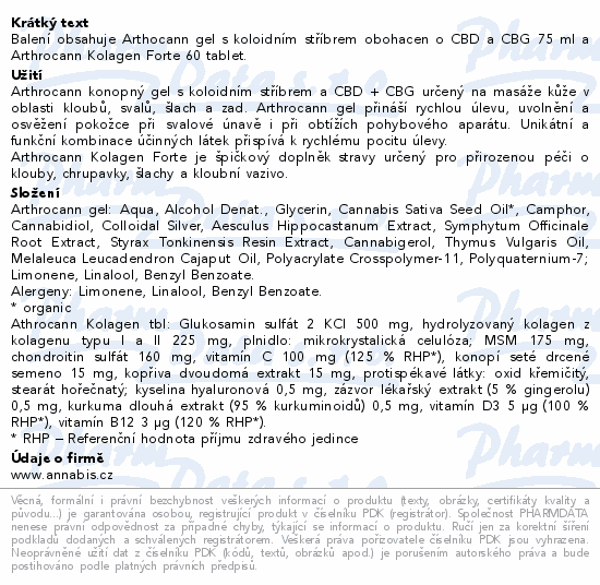 Balení obsahuje Arthocann gel s koloidním stříbrem obohacen o CBD a CBG 75 ml a Arthrocann Kolagen Forte 60 tablet.