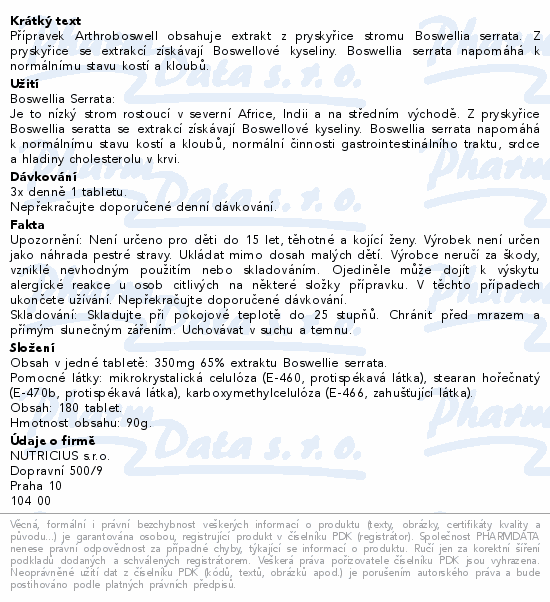 Přípravek Arthroboswell obsahuje extrakt z pryskyřice stromu Boswellia serrata. Z pryskyřice se extrakcí získávají Boswellové kyseliny. Boswellia serrata napomáhá k normálnímu stavu kostí a kloubů.