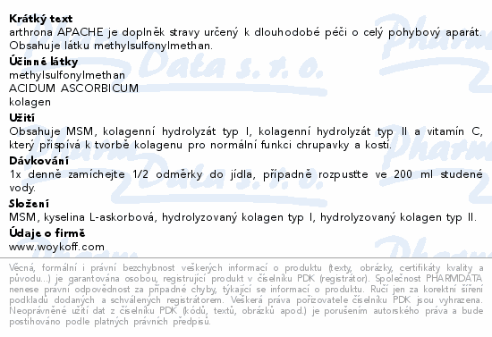 arthrona APACHE je doplněk stravy určený k dlouhodobé péči o celý pohybový aparát. Obsahuje látku methylsulfonylmethan.