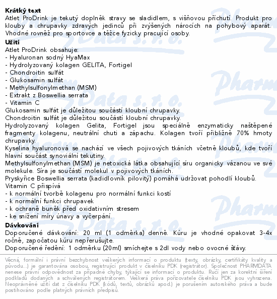 Atlet ProDrink je tekutý doplněk stravy se sladidlem, s višňovou příchutí. Produkt pro klouby a chrupavky zdravých jedinců při zvýšených nárocích na pohybový aparát. Vhodné rovněž pro sportovce a těžce fyzicky pracující osoby.