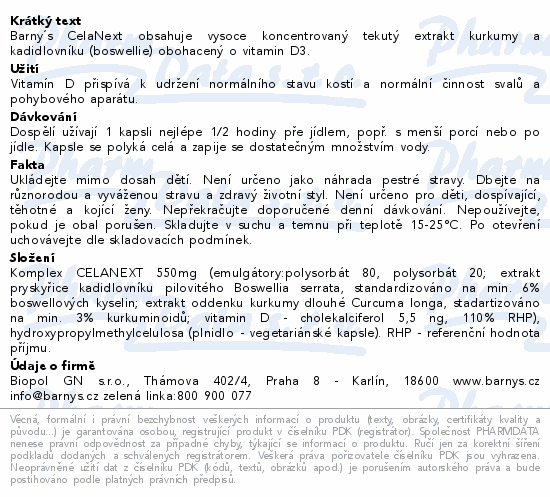 Barny´s CelaNext obsahuje vysoce koncentrovaný tekutý extrakt kurkumy a kadidlovníku (boswellie) obohacený o vitamin D3.