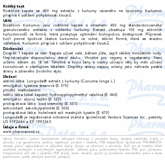 Rostlinné kapsle se 400 mg extraktu z kurkumy vázaného na lipozomy. Kurkumin přispívá k udržení pohyblivosti kloubů.