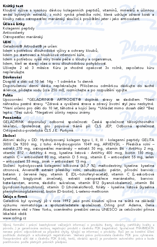 Kolagenní výživa kostí a chrupavek kloubů s antioxidanty a vitamíny AntiHcy. Geladrink Artrodiet je zdrojem látek s nutričním a fyziologickým účinkem doplňujícím běžnou stravu a lze jej užívat ke speciální a obohacené výživě kostí a chrupavek kloubů.