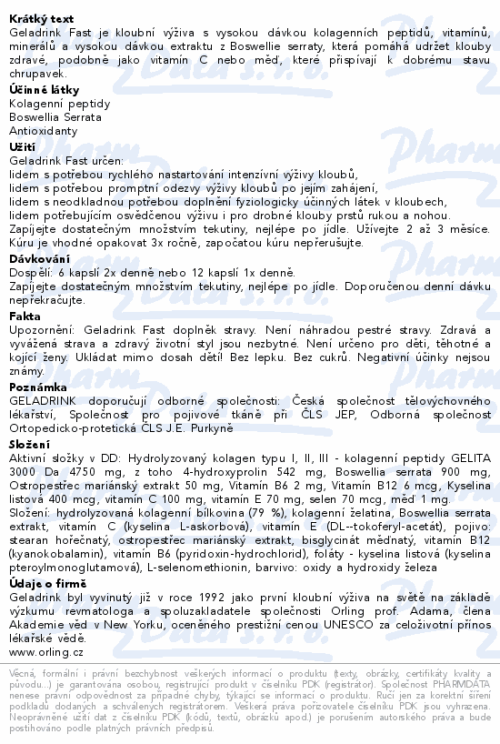 Kolagenní výživa kostí a chrupavek kloubů s antioxidanty a Boswellií Serratou. Geladrink Fast je zdrojem látek s nutričním a fyziologickým účinkem doplňujícím běžnou stravu a lze jej užívat k moderní a specifické výživě kostí a chrupavek kloubů.