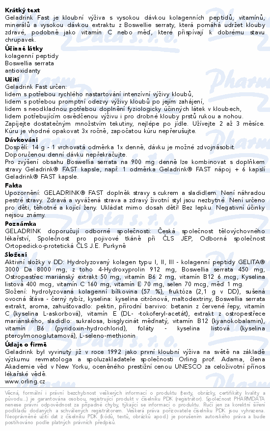 Kolagenní výživa kostí a chrupavek kloubů s antioxidanty a Boswellií Serratou. Geladrink Fast je zdrojem látek s nutričním a fyziologickým účinkem doplňujícím běžnou stravu a lze jej užívat k moderní a specifické výživě kostí a chrupavek kloubů.