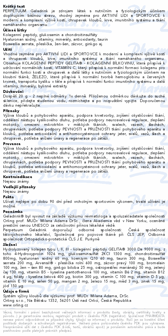 PERPETUUM Geladrink je zdrojem látek s nutričním a fyziologickým účinkem doplňujícím běžnou stravu, vhodný zejména pro AKTIVNÍ LIDI a SPORTOVCE k moderní a komplexní výživě kostí, chrupavek kloubů, krve, imunitního systému a tkání namáhaného organismu.