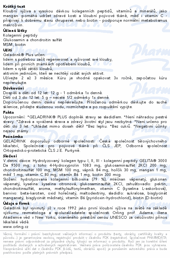 Kolagenní výživa kostí a chrupavek kloubů s organicky vázanou sírou a biotinem. Geladrink PLUS je zdrojem látek s nutričním a fyziologickým účinkem doplňujícím běžnou stravu a lze jej užívat k výživě kostí, chrupavek, kloubů, kůže a vlasů.