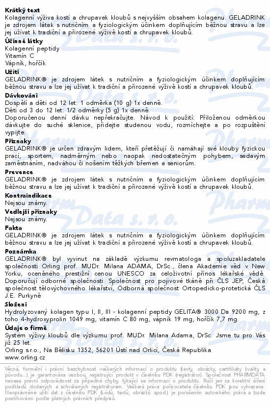 Kolagenní výživa kostí a chrupavek kloubů s nejvyšším obsahem kolagenu. GELADRINK je zdrojem látek s nutričním a fyziologickým účinkem doplňujícím běžnou stravu a lze jej užívat k tradiční a přirozené výživě kostí a chrupavek kloubů.