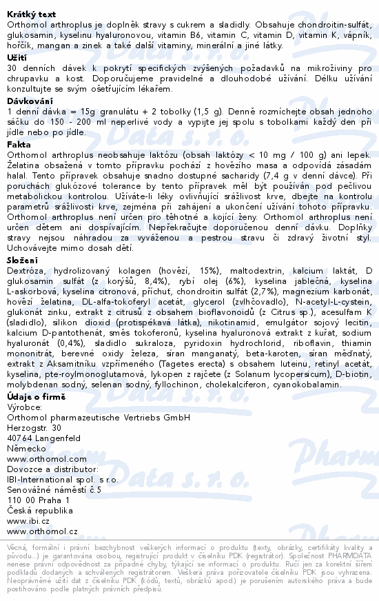 Orthomol arthroplus je doplněk stravy s cukrem a sladidly. Obsahuje chondroitin-sulfát, glukosamin, kyselinu hyaluronovou, vitamin B6, vitamin C, vitamin D, vitamin K, vápník, hořčík, mangan a zinek a také další vitaminy, minerální a jiné látky.