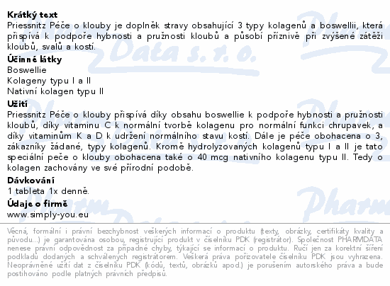 Priessnitz Péče o klouby je doplněk stravy obsahující 3 typy kolagenů a boswellii, která přispívá k podpoře hybnosti a pružnosti kloubů a působí příznivě při zvýšené zátěži kloubů, svalů a kostí.
