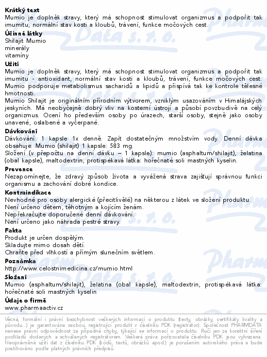 Mumio je doplněk stravy, který má schopnost stimulovat organizmus a podpořit tak imumitu, normální stav kosti a kloubů, trávení, funkce močových cest.